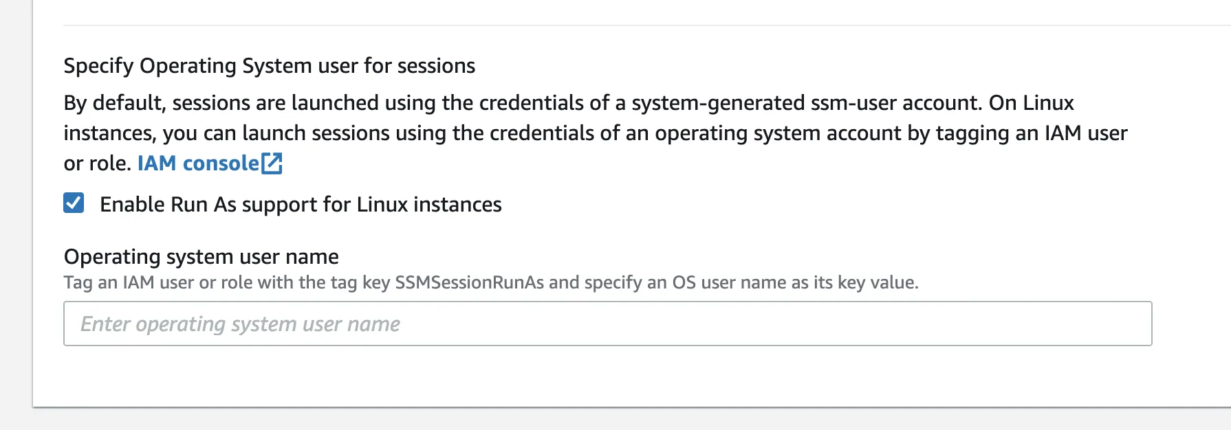 - policyレベルでユーザを指定したい場合は、TagsにSSMSessionRunAsを追加してValueにユーザ名を指定する。