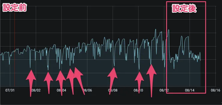 設定を変更する前は、涼しい時間が短時間しかありません。エアコンの温度設定を下げてもそれが有効になっている感じがしませんでした。