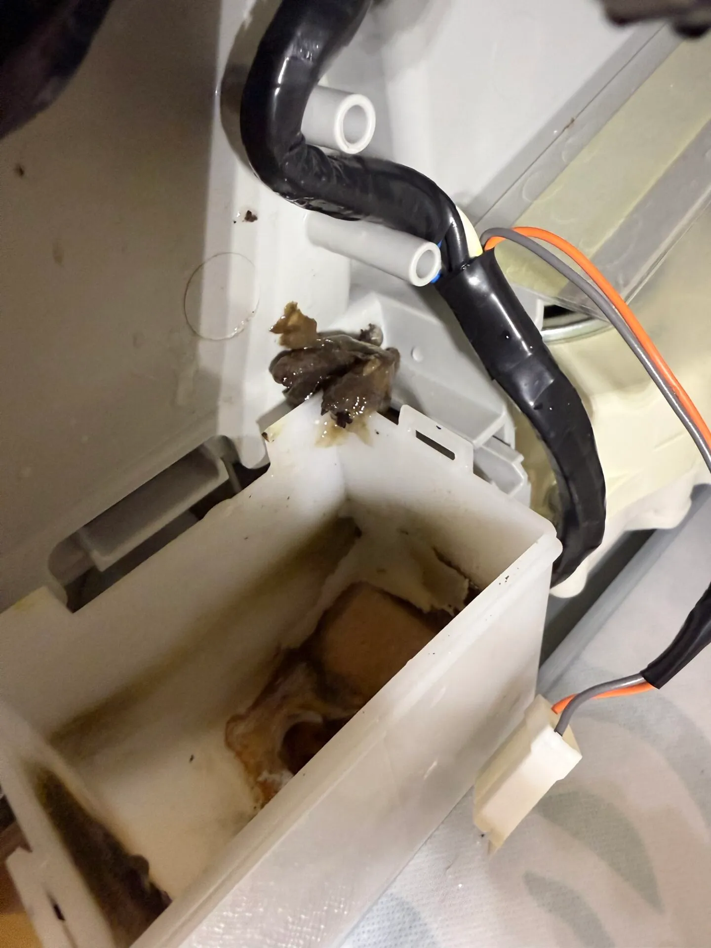 庫内を掃除するときに、どうしても排水部分に水が溜まっていて掃除不可能な箇所があって今まで気になってましたが、やはりそれが原因でヘドロが発生して配管が詰まるというのが今回の現象でした。定期的にクリーナーを使ってこのヘドロを融解するようなメンテナンスをする必要がありそうです。(取れるかもわかりませんが)