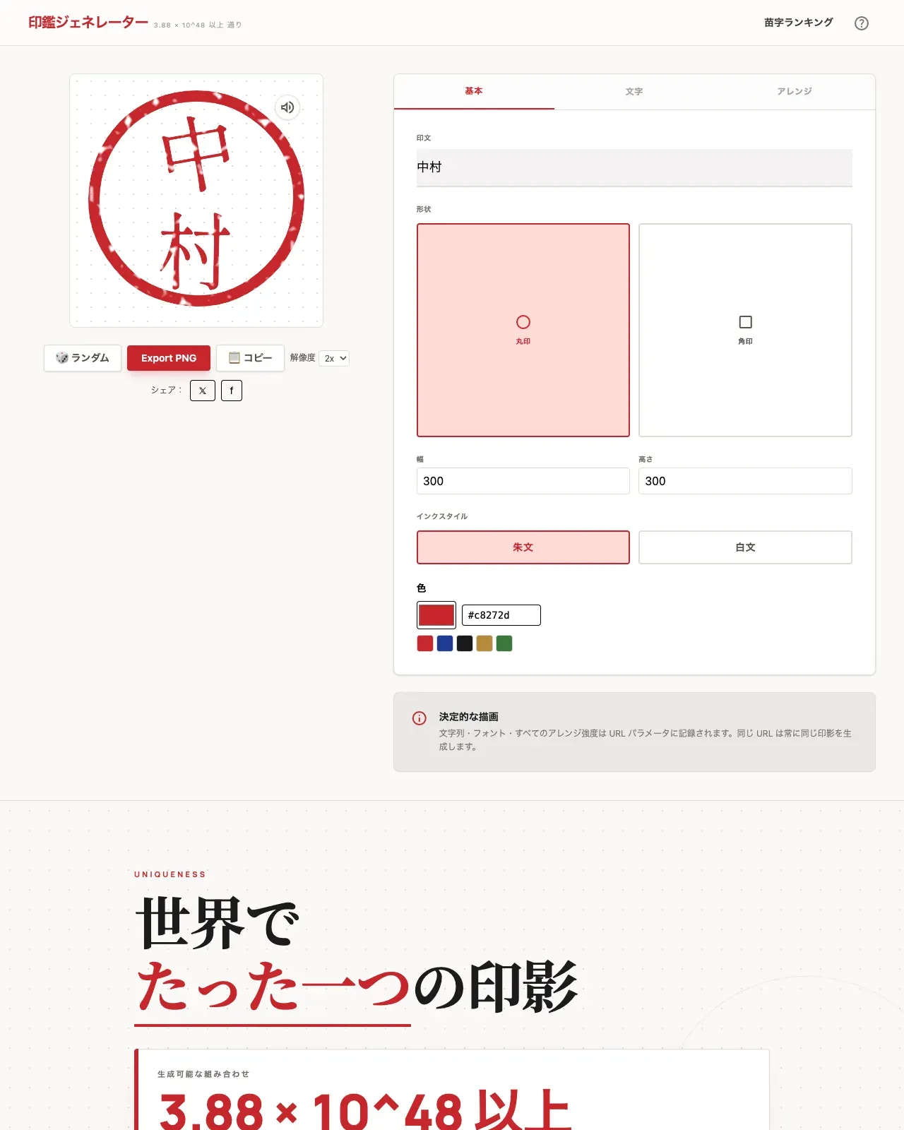 - 印影ユニーク度の表示:「あなたの印影は ◯◯ 通り中の 1 つです」を動的に計算して表示。フォント数 × 形状 × 効果値 × perChar の組合せから。