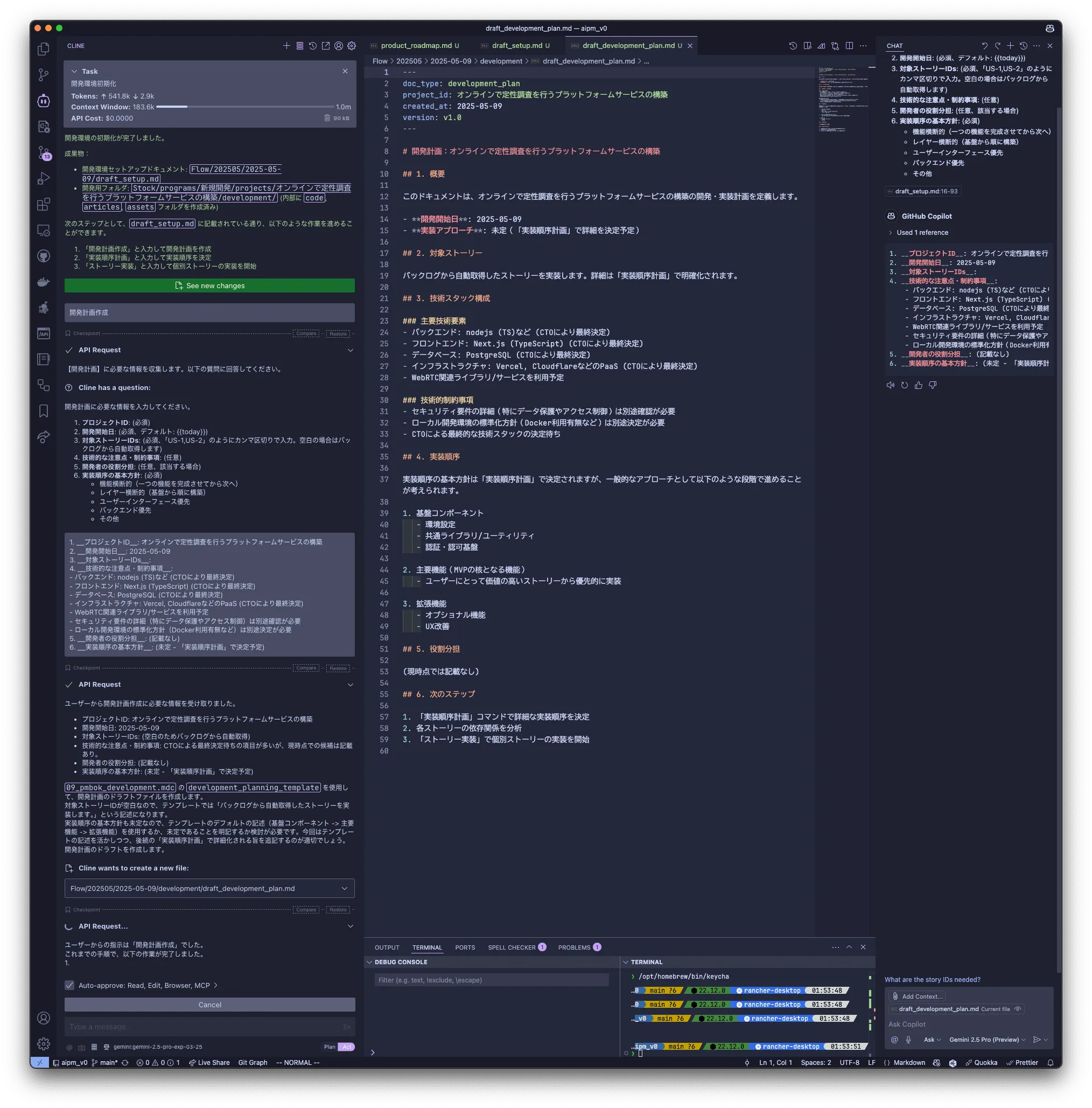 左画面にCline(AI PM)、右画面にCopilot(Gemini)という構成で作業を進めました。