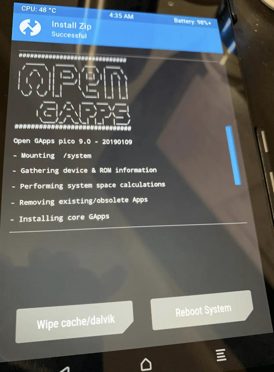 - unmountが必要だったりするのでそのままコピペではいけないけど、最終的にはAndroid 9 PieとgappsをNexus 7にインストールできた!しかし、ネットワーク周りが不安定で通信が出来ない!