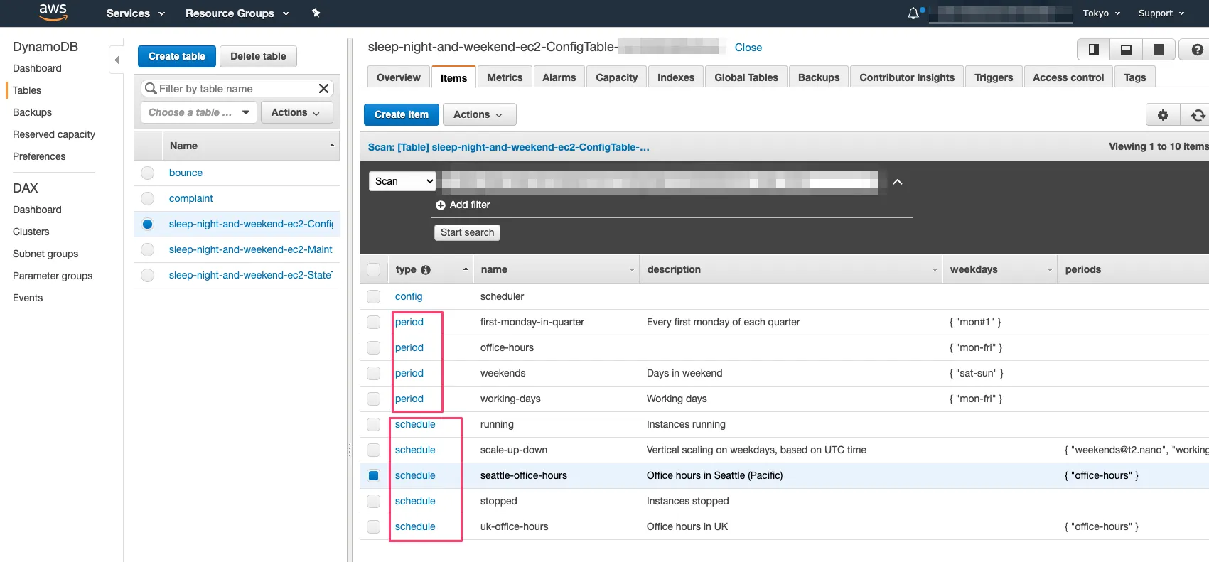 set periods office-hoursset schedule jp-office-hoursset description "Office hours in Japan"set stack sleep-night-and-weekend-ec2set aws_profile defaultset region ap-northeast-1scheduler-cli create-schedule --stack $stack --name $schedule --periods $periods --description "$description" --timezone Asia/Tokyo --profile-name $aws_profile --region $region以下のレコードが追加されます。