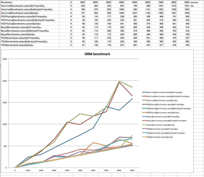 ちなみに、2年前にベンチマークを取ったときには、Doctrine1はPDOの約3倍遅かった。