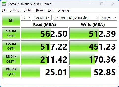 CrystalDiskMarkではこんな感じです。速度が遅いので、128MiBで計測しています。