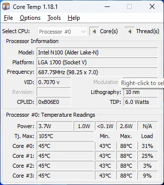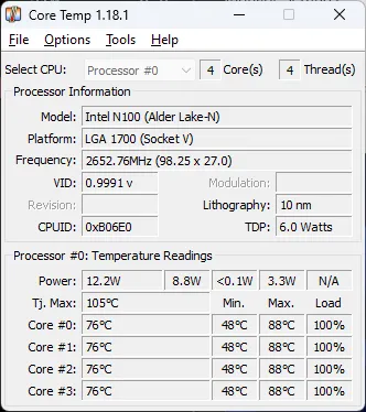 CPUコア温度を測定してみると、負荷が高い状況ですと大体76度程度。最高88度まで上がってます。