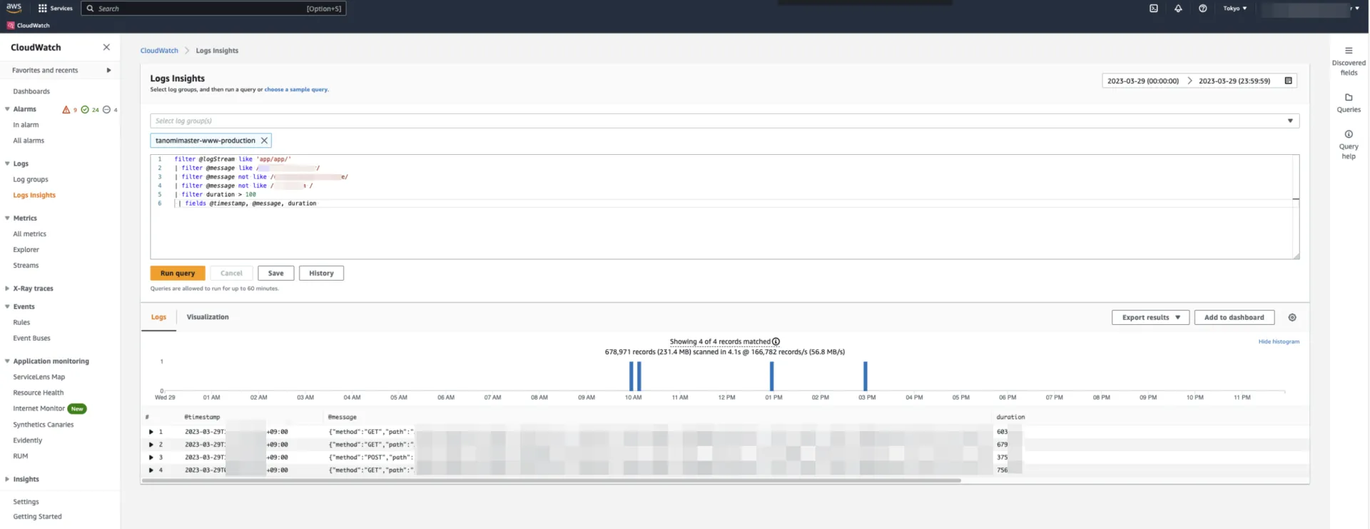 filter @logStream like 'app/app/'| filter @message like /include/| filter @message not like /exclude/| filter duration > 100 | fields @timestamp, @message, duration CloudWatchのlog insightでの調査例