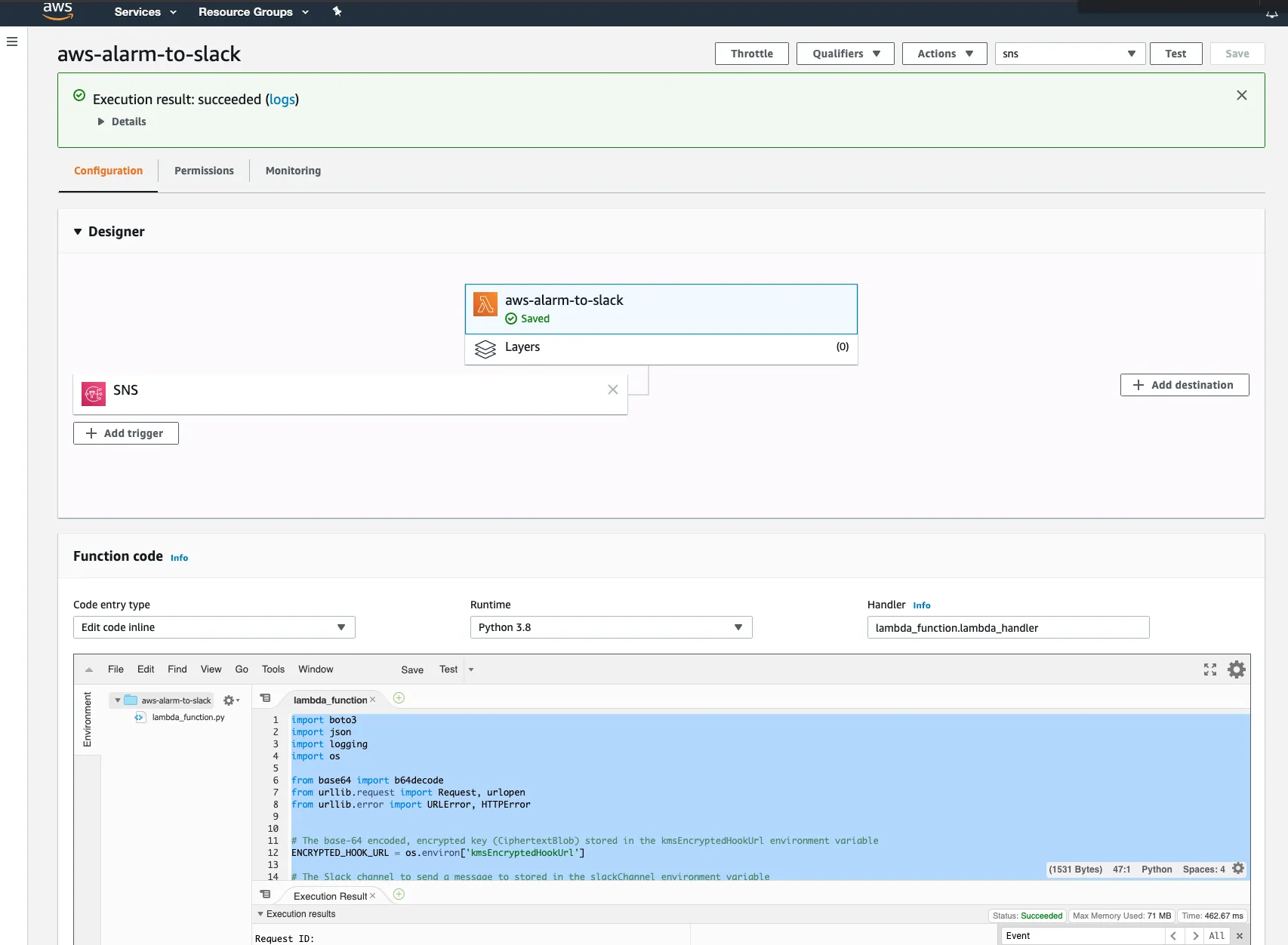 - CloudWatch => SNS => Lambda (with KMS) => Slack webhook という流れ。