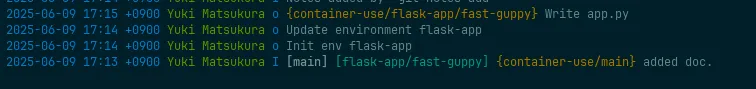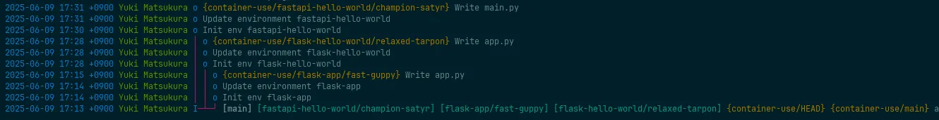 What's next: Try Docker Debug for seamless, persistent debugging tools in any container or image → docker debug 6bd9 Learn more at https://docs.docker.com/go/debug-cli/tig --all コマンドでリビジョングラフを確認してみると、勝手にブランチが作られて、自分の名前でコミットが3つ積まれていました。