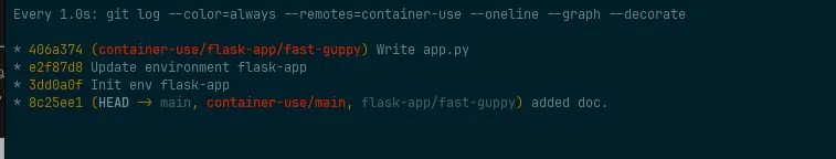 cu watchコマンドでcontainer-useの動作状態を見られるとのことなのでコマンドを実行してみましたが、どうやら裏ではGit logコマンドを1秒おきに実行しているだけのようです。