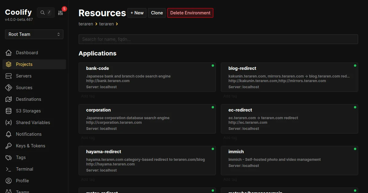 xxx.teraren.com→localhost:3000)はそのまま優先される - 新サービスはCoolifyにデプロイ。ワイルドカードでキャッチされる