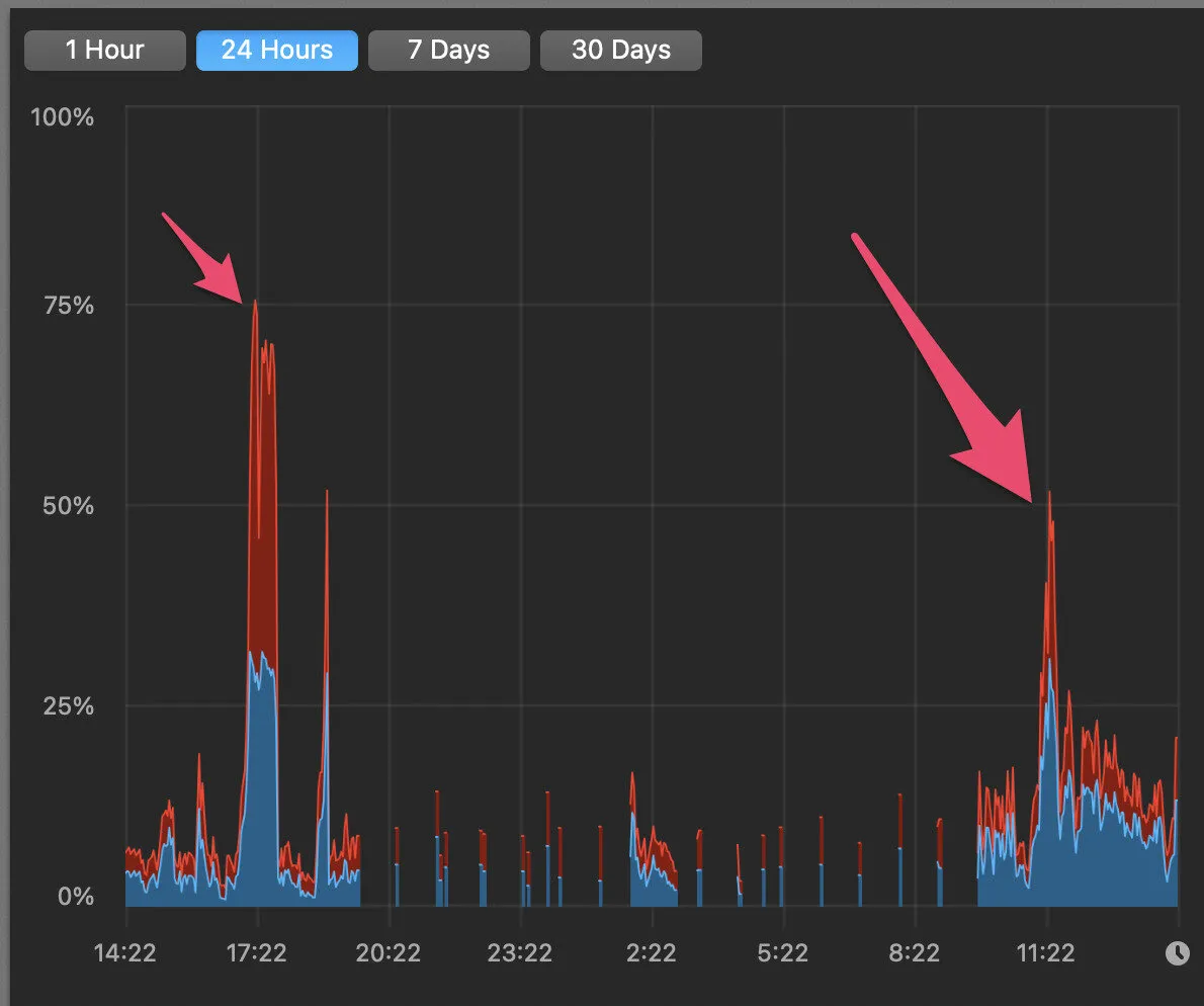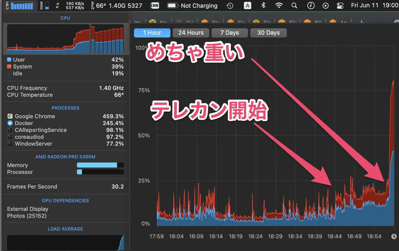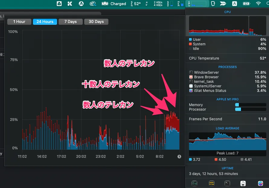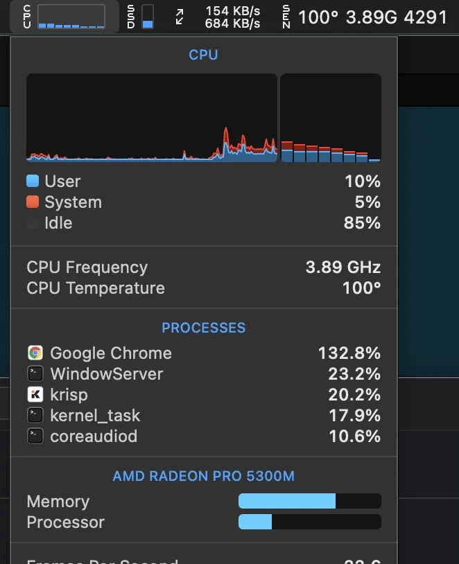 - テレカン中には、Chromeの負荷が高くなるのはもちろんのこと、krisp(ノイズキャンセリングをソフトウェアでやるやつ)もそこそこCPUを食うことがわかります。