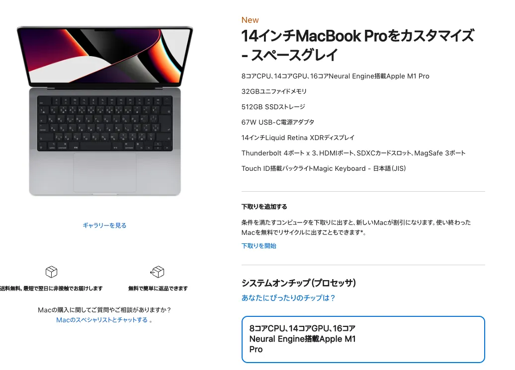 買ったのはこちらのMacBook Pro 14inch M1 Pro