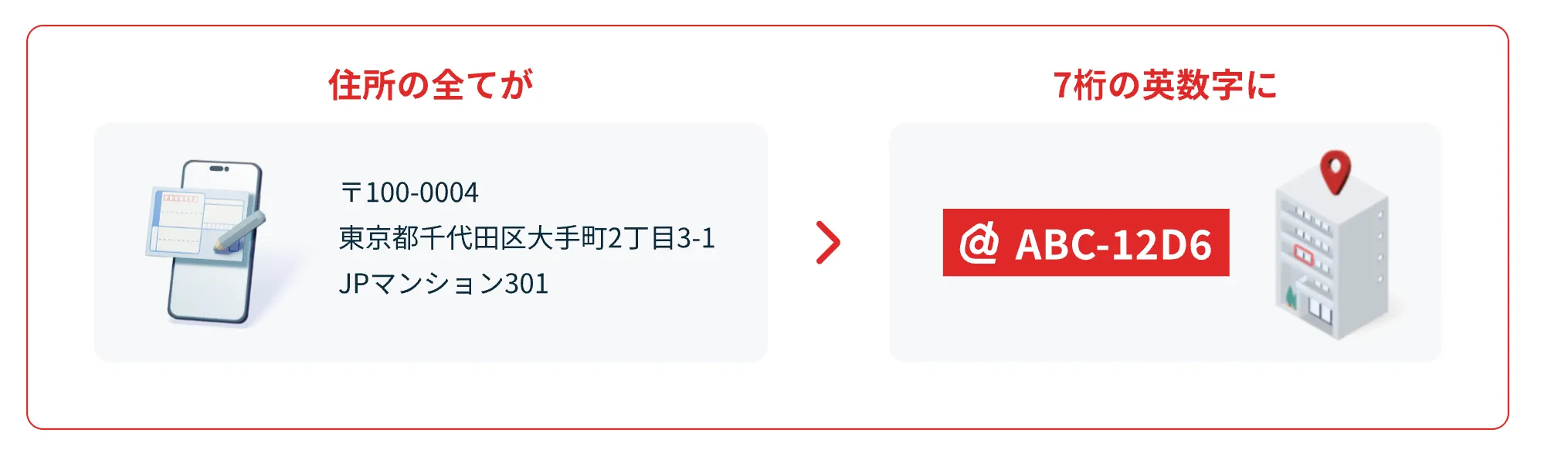 - デジタルアドレスは日本郵便が提供する 7 桁のランダムな英数字で住所にマッピングする仕組み