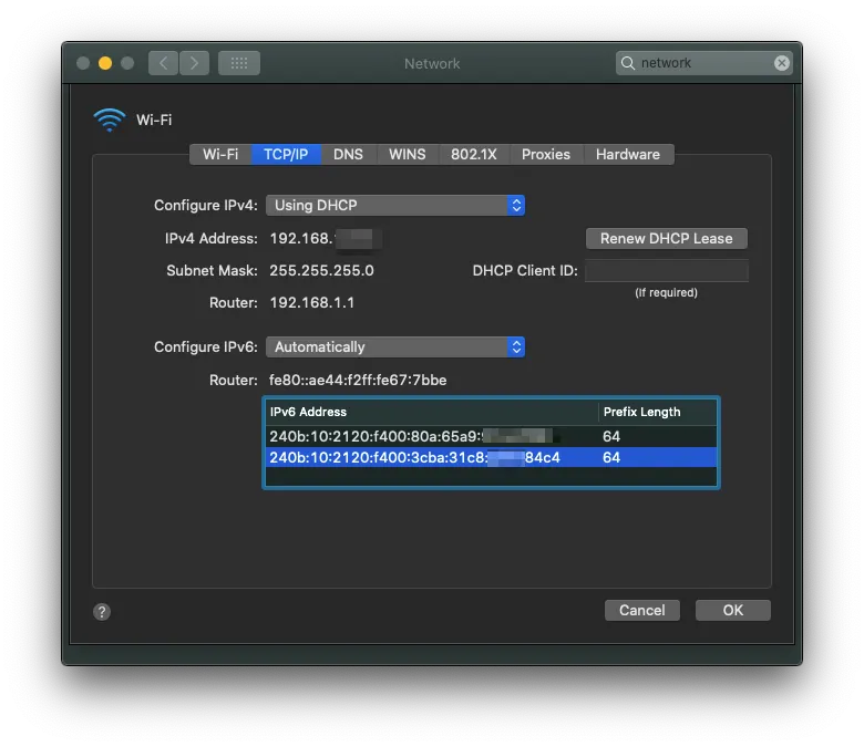 matsu@dell ~> sudo sysctl net.ipv6.conf.wlx0013eff32167.use_tempaddrnet.ipv6.conf.wlx0013eff32167.use_tempaddr = 2matsu@dell ~> curl https://v6.ident.me/240b:10:2120:f400:edc1:bcf0:567b:785d