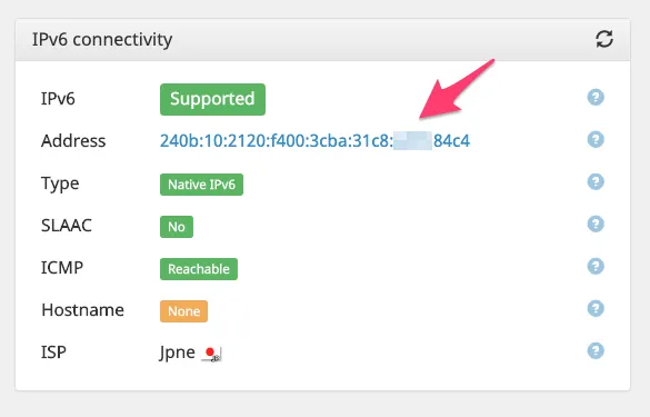 https://ipv6-test.com/ にGoogle Chromeでアクセスすると、この変更されたipv6のアドレスが表示されます。