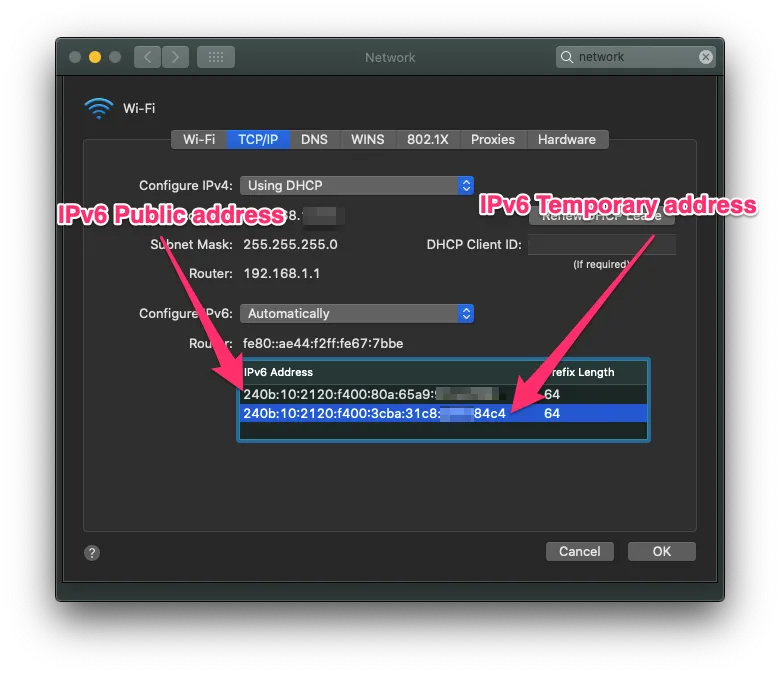 例えば、macosでは以下のようなIPv6アドレスの表示があり、片方が一時アドレスになります。