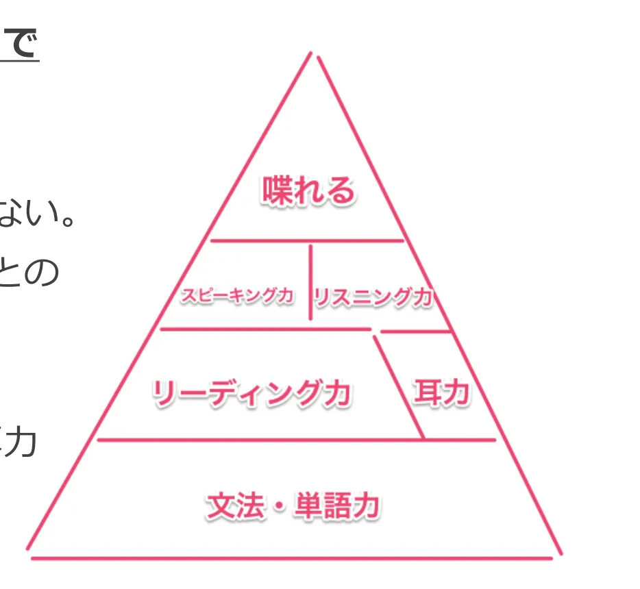 語学留学すると、ピラミッドの全てをまんべんなく全方位で鍛えられる。学生だから間違っても許容される。ミドルくらいのスキルの人にはコスパは最強かと思う。