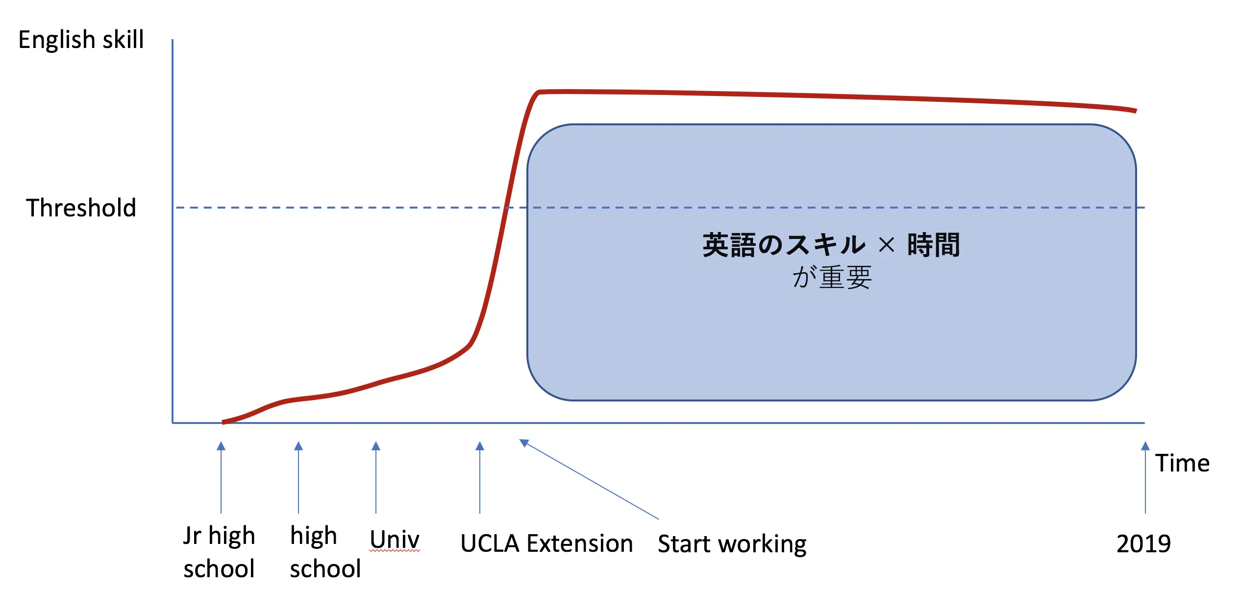 - 主観的な自分の英語スキルは以下のようなイメージ。アメリカに居るときになんか慣れたって感じです。日本で地道に勉強していたら、なかなか達成出来ない壁を簡単に突き破った感じがします。