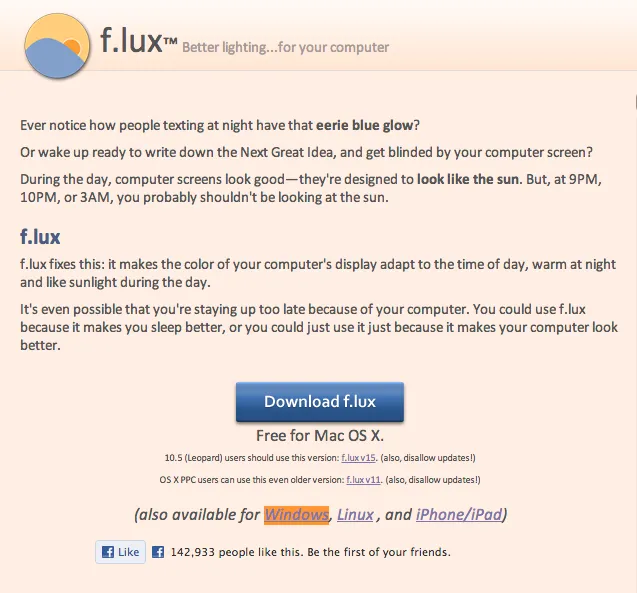 f.lux http://stereopsis.com/flux/ これを使えば、JINS PC要りません! ソフトウェアでディスプレイの青色成分を減らしてくれます。 設定はこんな感じで、任意のホワイトバランスに設定出来ます。↓