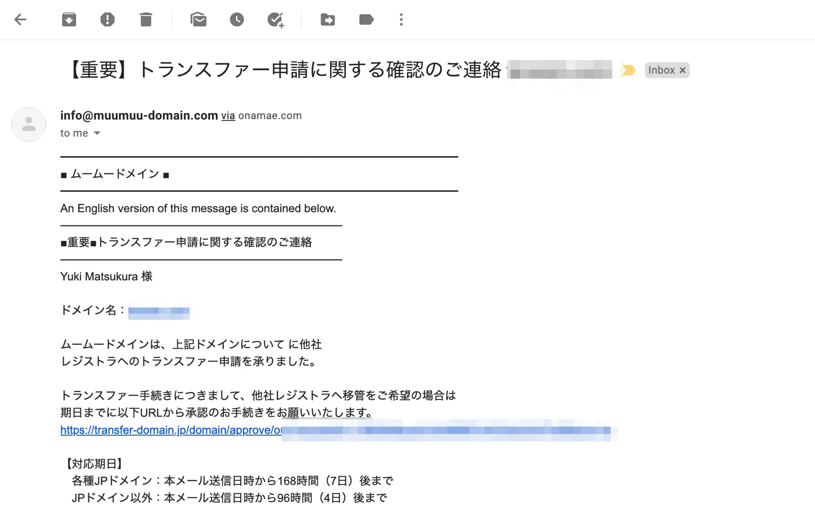 数十分待つと、以下のようなメールが移管元のレジストラから来ますので、承認手続きを進めます。