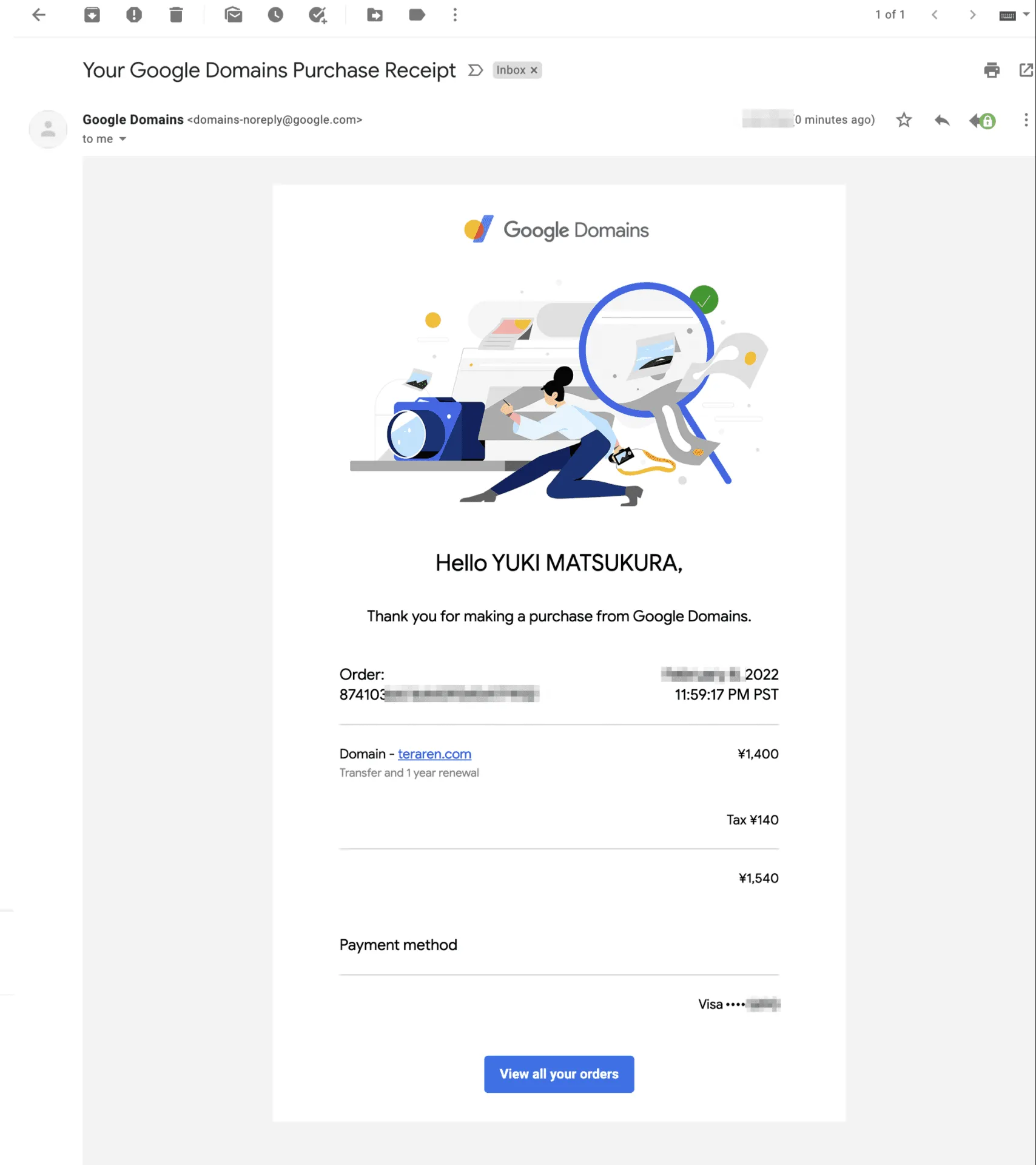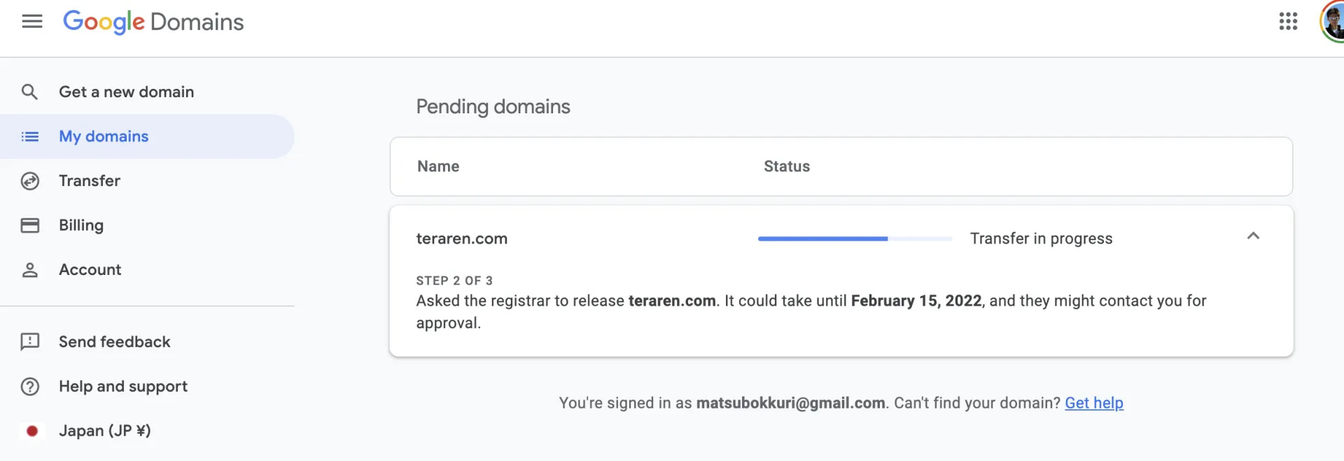 5分ぐらいすると、移管が完了したメールが移管先のGoogle Domainsから届きます。