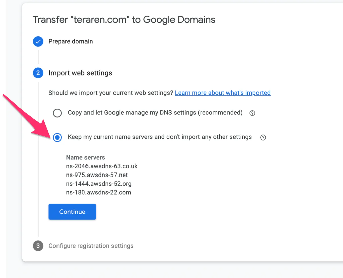 - 移管時に、DNSレコードをGoogleで管理するか聞かれますが、これにはNoと回答する必要があります。設定をインポートすると書いてありますが、今はAWSで管理していてすべてをインポートできるわけではないからです。