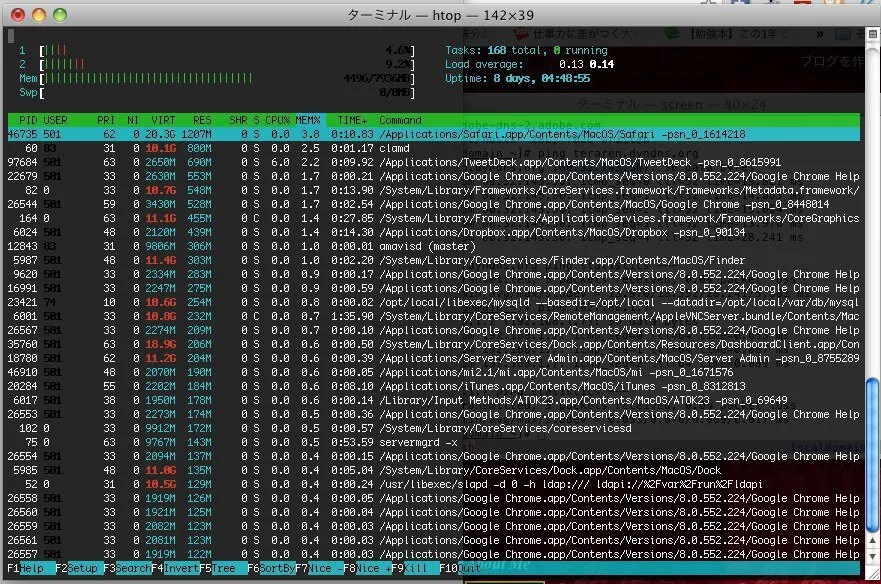 htopとは、topコマンドの進化したバージョン。topコマンドはすべてキーボードショートカットを覚えた上で利用しなければなりませんが、htopではわかりやすいインターフェイスを備えています。