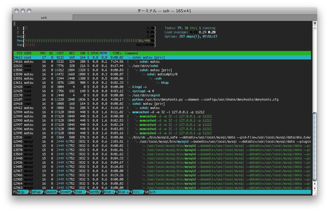 htopとは、topコマンドの進化したバージョン。topコマンドはすべてキーボードショートカットを覚えた上で利用しなければなりませんが、htopではわかりやすいインターフェイスを備えています。