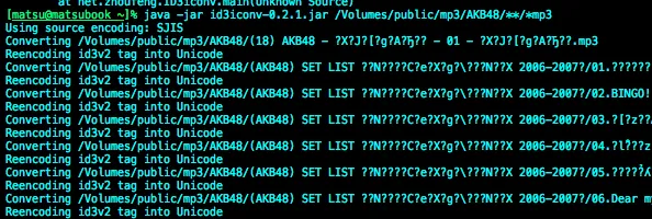 % wget http://www.zhoufeng.net/eng/id3iconv/download/id3iconv-0.2.1.jar% java -jar id3iconv-0.2.1.jar file.mp3 ID3タグをUNICODEへ変換