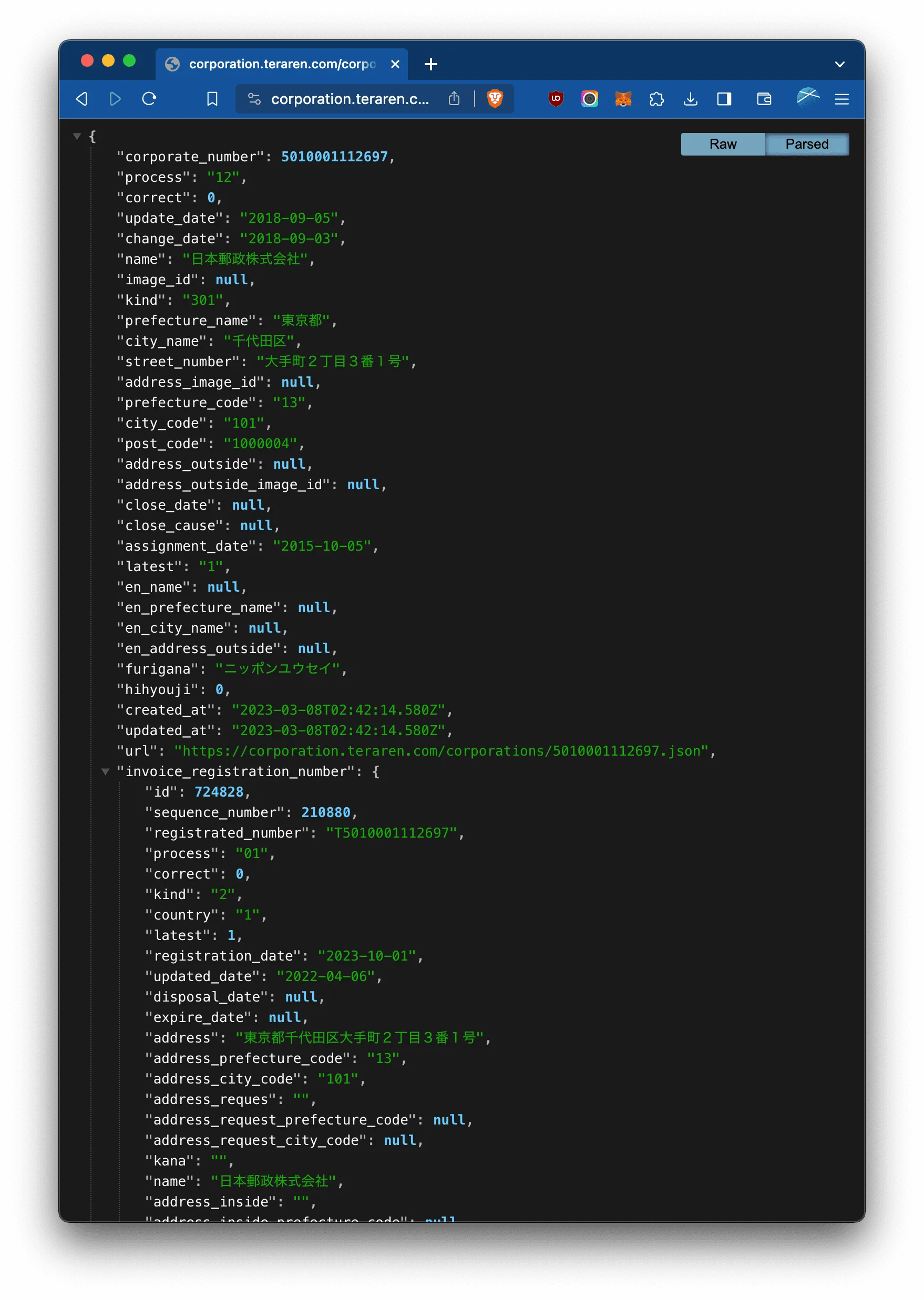 =WEBSERVICE(URL)サーバサイドで、上記の呼び出しに使えるエンドポイントを用意してあります。 例えば、日本郵政のインボイス番号を取得するには以下のURLになります。