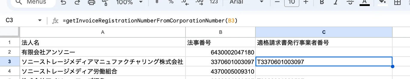 =getInvoiceRegistrationNumberFromCorporationNumber("3370601003097")実際には別のカラムに法人番号があると思いますので以下のようになると思います。