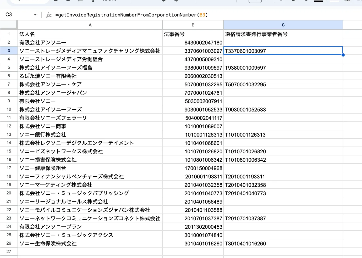 =getInvoiceRegistrationNumberFromCorporationNumber("3370601003097")実際には別のカラムに法人番号があると思いますので以下のようになると思います。