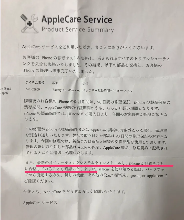 - 修理に出す前には、バッテリーに問題は無い状態ですが、さすがに1年弱使うと少し電池の持ちが若干悪くなってきたので依頼してみました。