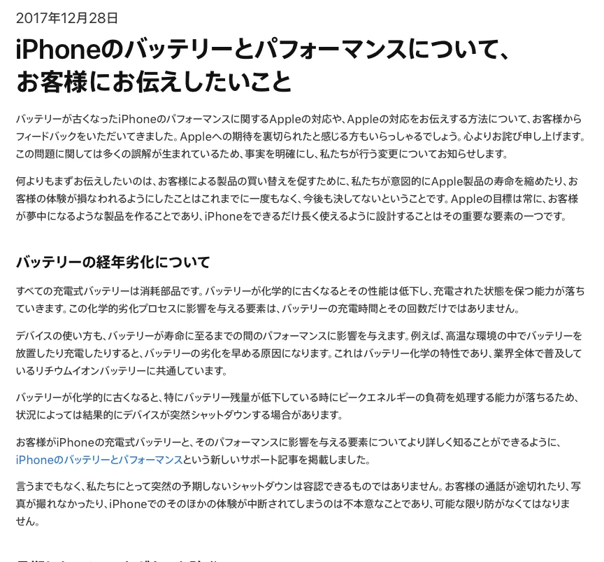 iPhone SE、iPhone 6、iPhone 6 Plus、iPhone 6s、iPhone 6s Plus、iPhone 7、iPhone 7 Plus、iPhone 8、iPhone 8 Plus、iPhone Xを対象にしたバッテリー交換プログラムに関して、非正規品バッテリーでなければ、希望するユーザー全てを対象に提供が開始されている。