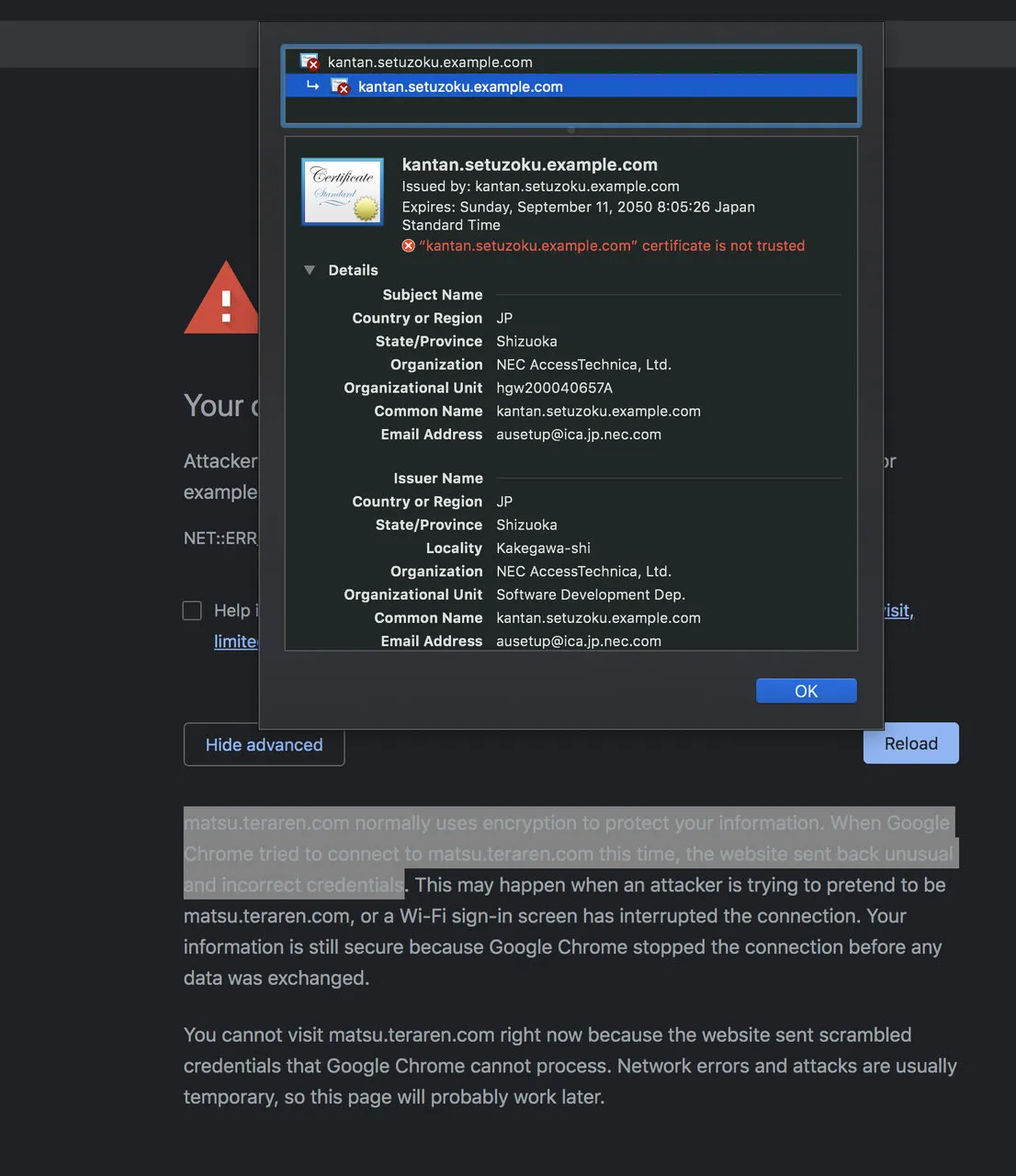 LANで公開しているサーバにアクセスしたら、TSLの証明書エラーが出ました。“kantan.setuzoku.example.com”というホスト名に対して発行された証明書が返答された模様。