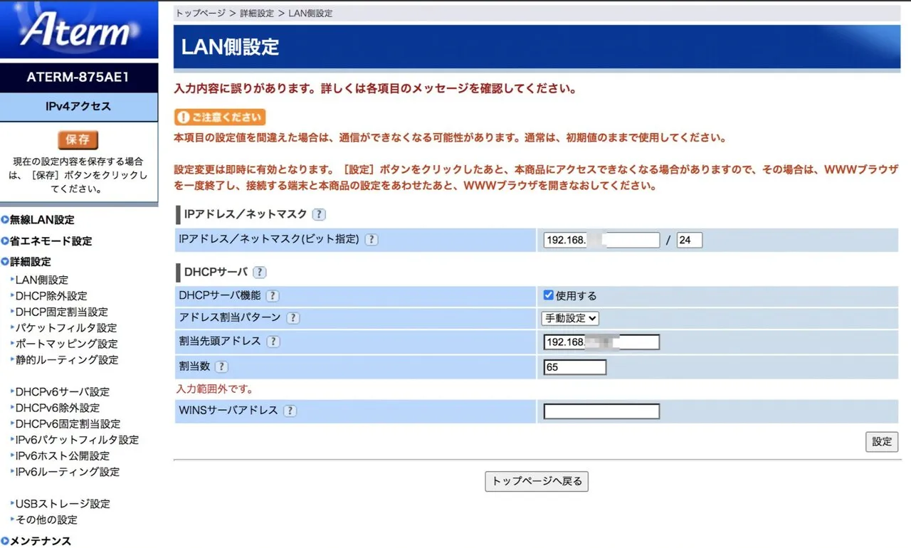 DHCPサーバのIPv4割当アドレスの数が最大64だけしかありません!65と指定すると「入力範囲外」と表示されて設定できません。大量のノードを運用されている方は、ネットワークを分割するなどの対策が必要になります。