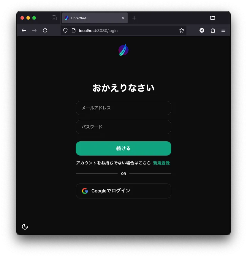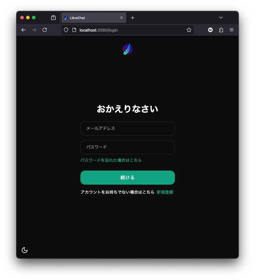 % git clone [email protected]:danny-avila/LibreChat.git% cd LibreChat% cp .env.example .env% open 'http://localhost:3080/login'ブラウザで開くと以下のような画面が表示されます。