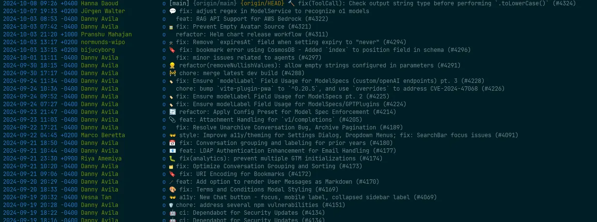 ❯ diff librechat.example.yaml librechat.yaml108a109,131> - name: "Ollama"> apiKey: "ollama"> baseURL: "http://ollama:11434/v1/chat/completions"> models:> default: [> "llama2",> "gemma2",> "mistral",> "codellama",> "dolphin-mixtral",> "mistral-openorca"> ]> # fetching list of models is supported but the name field must start> # with ollama (case-insensitive), as it does in this example.> fetch: true> titleConvo: true> titleModel: "current_model"> summarize: false> summaryModel: "current_model"> forcePrompt: false> modelDisplayLabel: "Ollama"default セクションでモデル名を指定しています。fetch セクションで true を指定していれば、動的に ollama のサーバから取得するので気にしないで大丈夫です。
