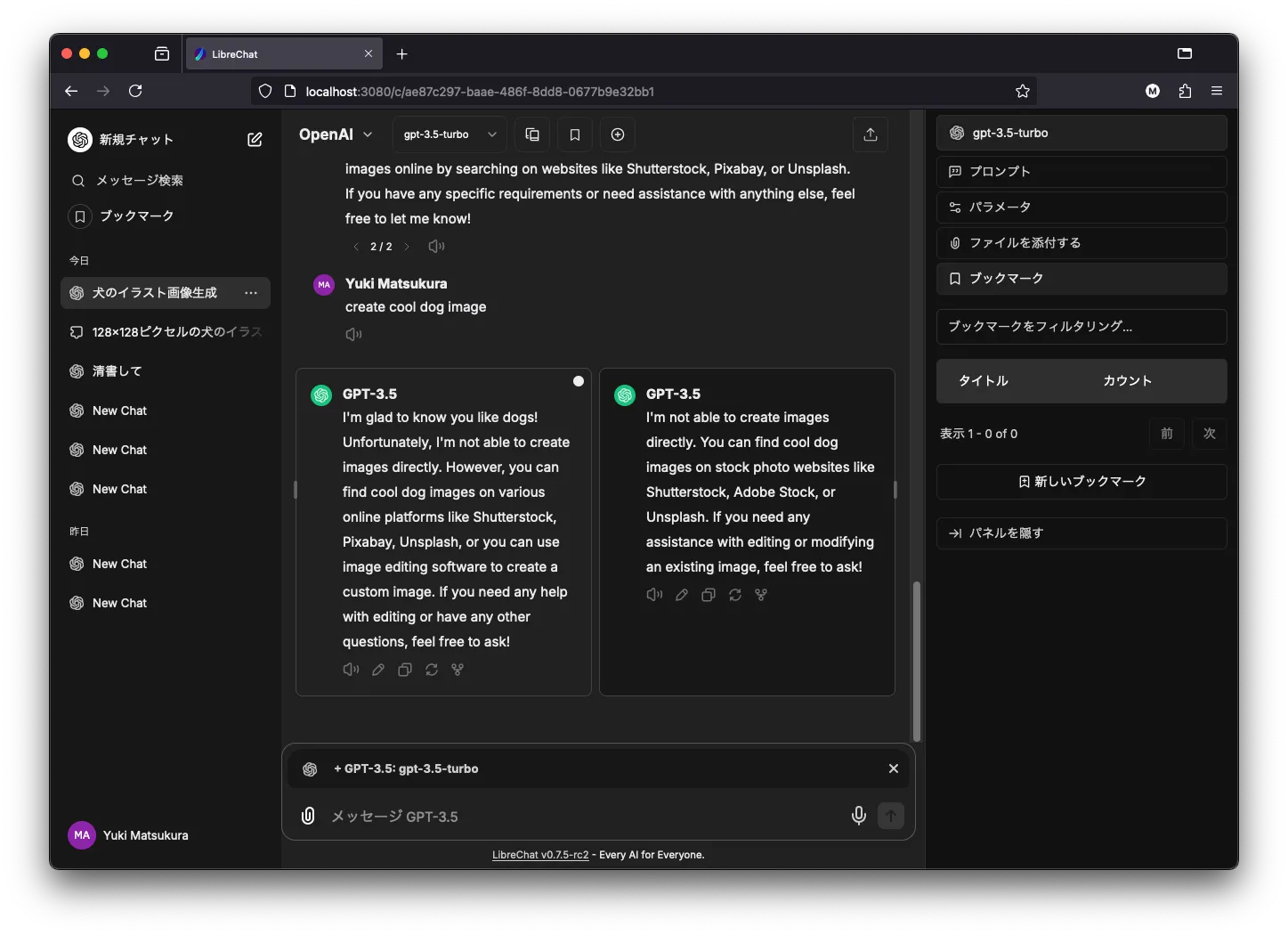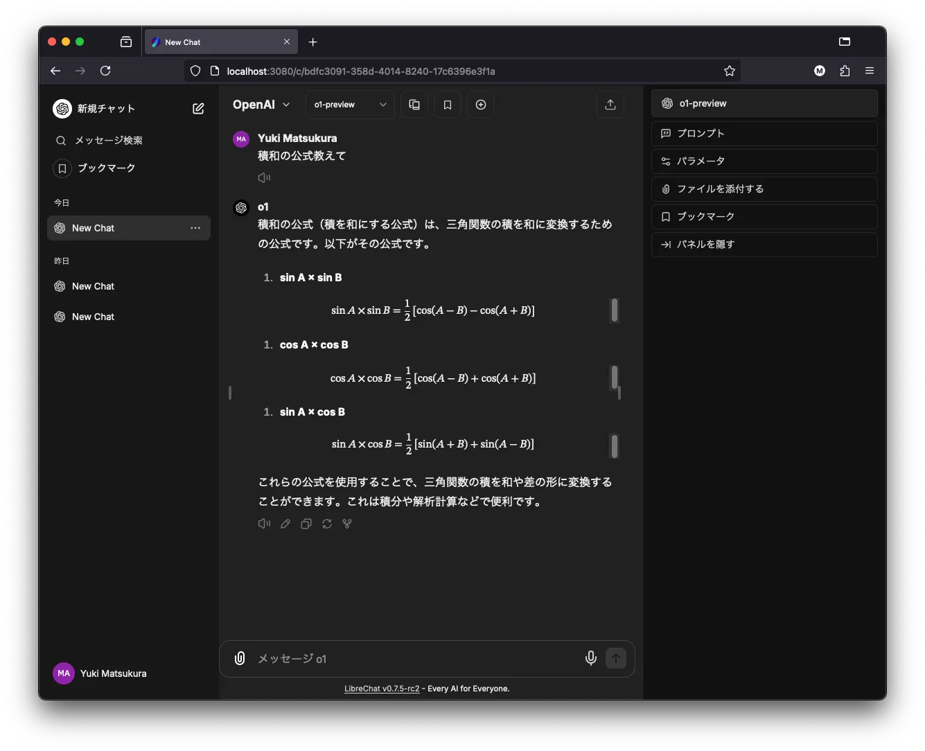 ❯ diff .env.example .env171c171< OPENAI_API_KEY=user_provided---> OPENAI_API_KEY=sk-proj-xxxxxxxxxxxxxxxxxxxxxxx画面の左上から利用するモデルを選んで、テキストを打ち込みます。 以下の画像のような感じで動作します。UIはChatGPTと同様です。