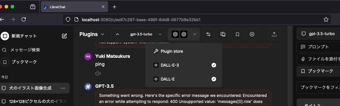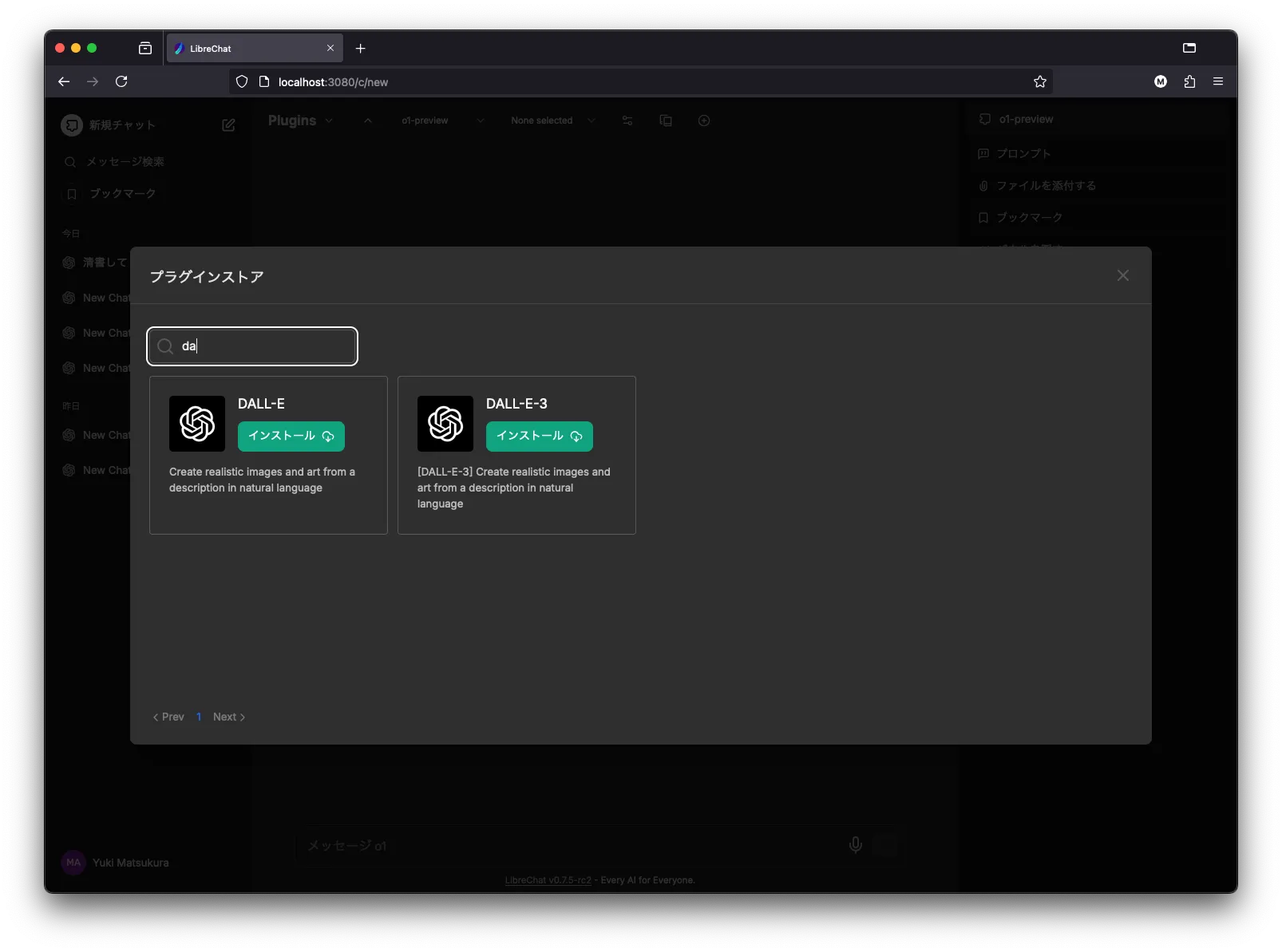 ❯ diff .env.example .env236,238c236,238< # DALLE_API_KEY=< # DALLE3_API_KEY=< # DALLE2_API_KEY=---> DALLE_API_KEY=sk-proj-xxxxxxxxxxxxxxxxxxxxxxx> # DALLE3_API_KEY=sk-proj-xxxxxxxxxxxxxxxxxxxxxxx> # DALLE2_API_KEY=sk-proj-xxxxxxxxxxxxxxxxxxxxxxxプラグインストアでDall−Eをインストールします。