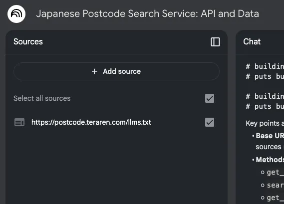 +++ b/app/views/home/llms.text.erb@@ -0,0 +1,85 @@+# Japanese Postcode Search++> A comprehensive Japanese postcode search service that provides detailed address information, including buildings and offices, with support for Japanese, kana, and romanized text.++This service maintains a database of Japanese postcodes with associated address information at multiple levels (prefecture, city,...NotebookLMに入れて使ってみる