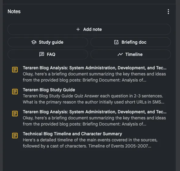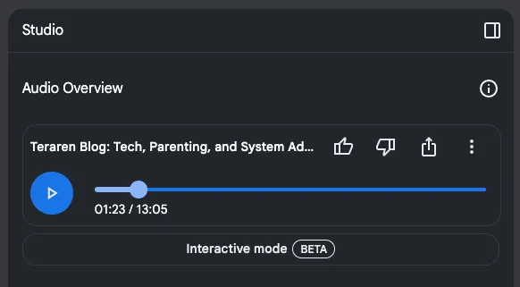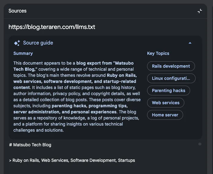 - [タブレット端末を壁掛けして情報端末として使うといろいろ捗る](https://blog.teraren.com/2024/08/27/tablet-on-the-wall/): 概要 半年ぐらい前から、壁にタブレット端...- [Web魚拓: 「研究」と「勉強」の違い](https://blog.teraren.com/2024/08/27/diff-study-research/): 概要 過去に何度も参照している以下のペー...- [寝室のライトを「とったらリモコン」に変更して快適子育て生活](https://blog.teraren.com/2024/08/15/downlight-remote-control/): 概要 リビングの調光スイッチを「とったら...- [生成系AIサービスから自分のサイトをブロックする方法](https://blog.teraren.com/2024/08/02/block-llm-crawler/): サイトのトップに以下のrobots. t...NotebookLM に入れて、LLMS.txt を元にしたサマリーを出力してみます。 レジュメにかけそうな紹介文を書いてくれてます。 (Google のロケールが英語っぽいので英語出でてきちゃってます)