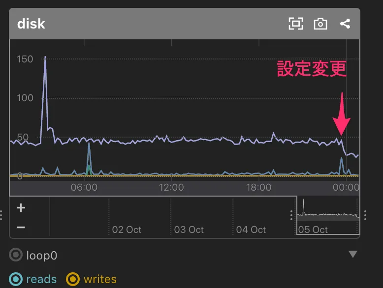 docker statsでみてみるととあるプロセスのBLOCK I/Oが多いので、書き込みをなくすようにプログラム側を変更して対処して更に一段とディスクIOを減らしました。