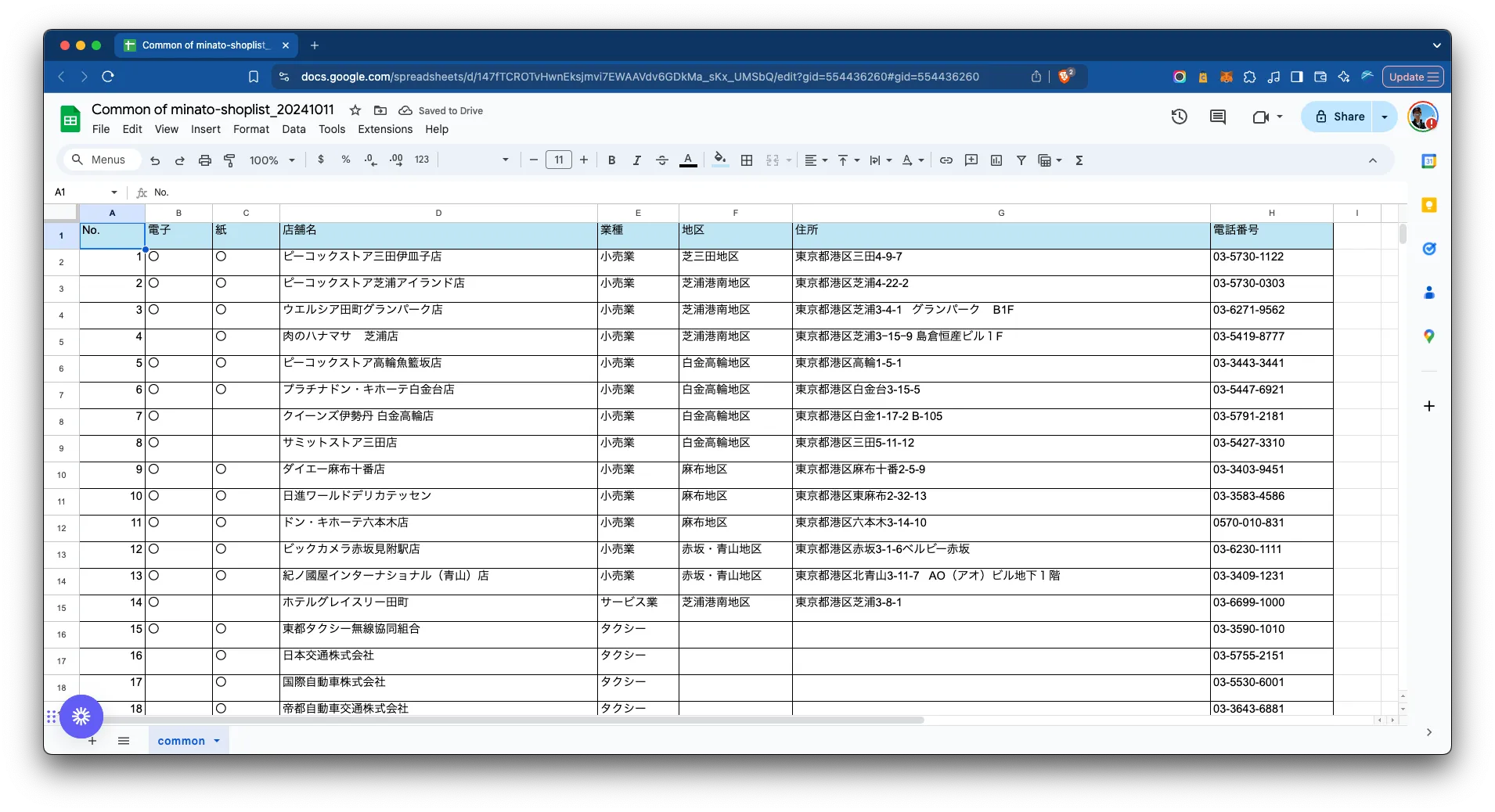 まず、港区商店街連合会が 公開しているPDFから利用可能店舗のデータを抽出しました。このデータには店舗名、住所、業種などの情報が含まれていました。
