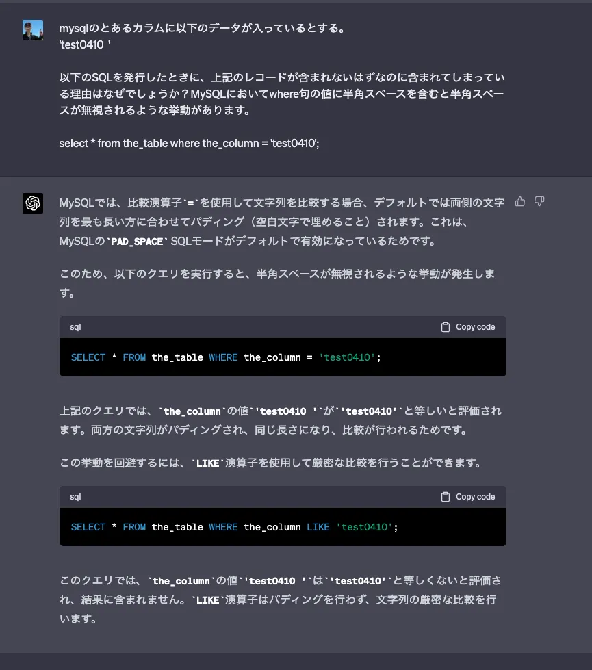 MySQLのcollationによって、カラムの値にある最後の半角スペースがいくつあっても同一に扱われる場合がある。