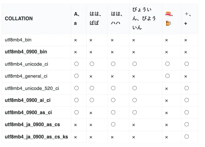 MySQL > show collation where collation like 'utf8mb4%' and collation like '%bin';+------------------+---------+-----+---------+----------+---------+---------------+| Collation | Charset | Id | Default | Compiled | Sortlen | Pad_attribute |+------------------+---------+-----+---------+----------+---------+---------------+| utf8mb4_0900_bin | utf8mb4 | 309 | | Yes | 1 | NO PAD || utf8mb4_bin | utf8mb4 | 46 | | Yes | 1 | PAD SPACE |+------------------+---------+-----+---------+----------+---------+---------------+2 rows in set (0.004 sec)こちらの比較表からしても、用途としては基本的にすべて区別したいのでutf8mb4_0900_binが良さそうです。