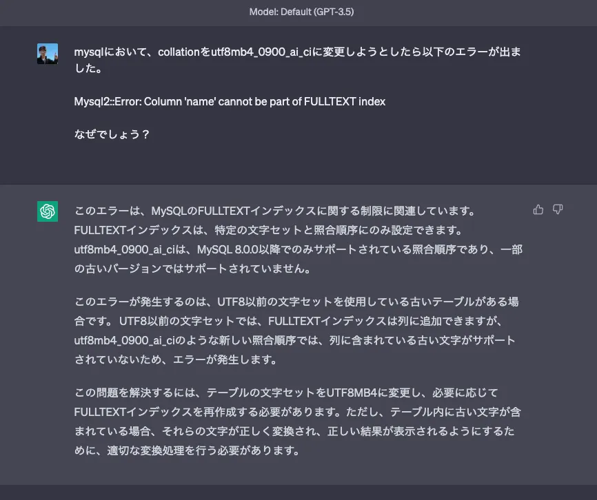 ちなみに、GPT-3.5だと的確な原因を指摘するところまではやってくれませんでした。