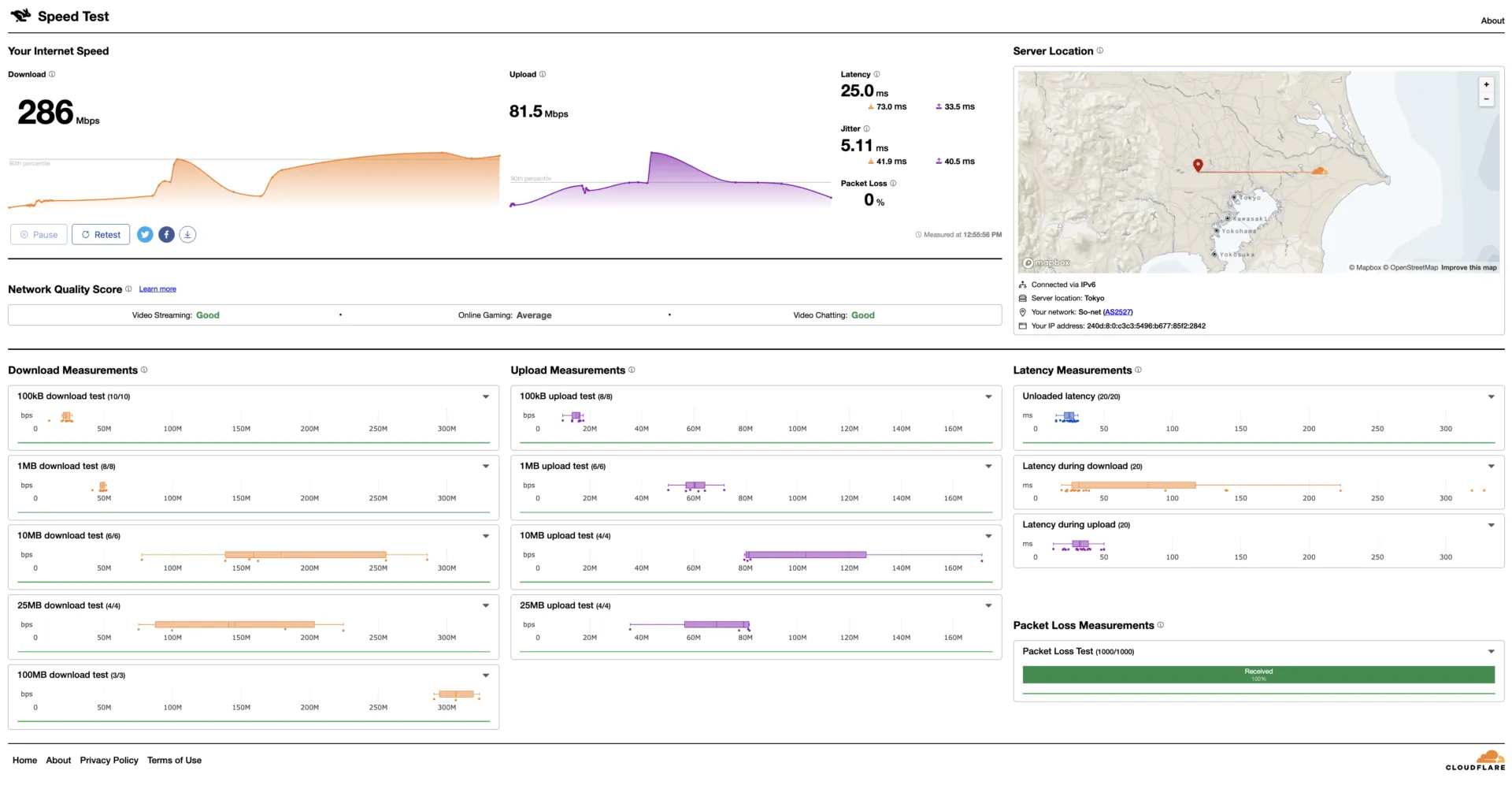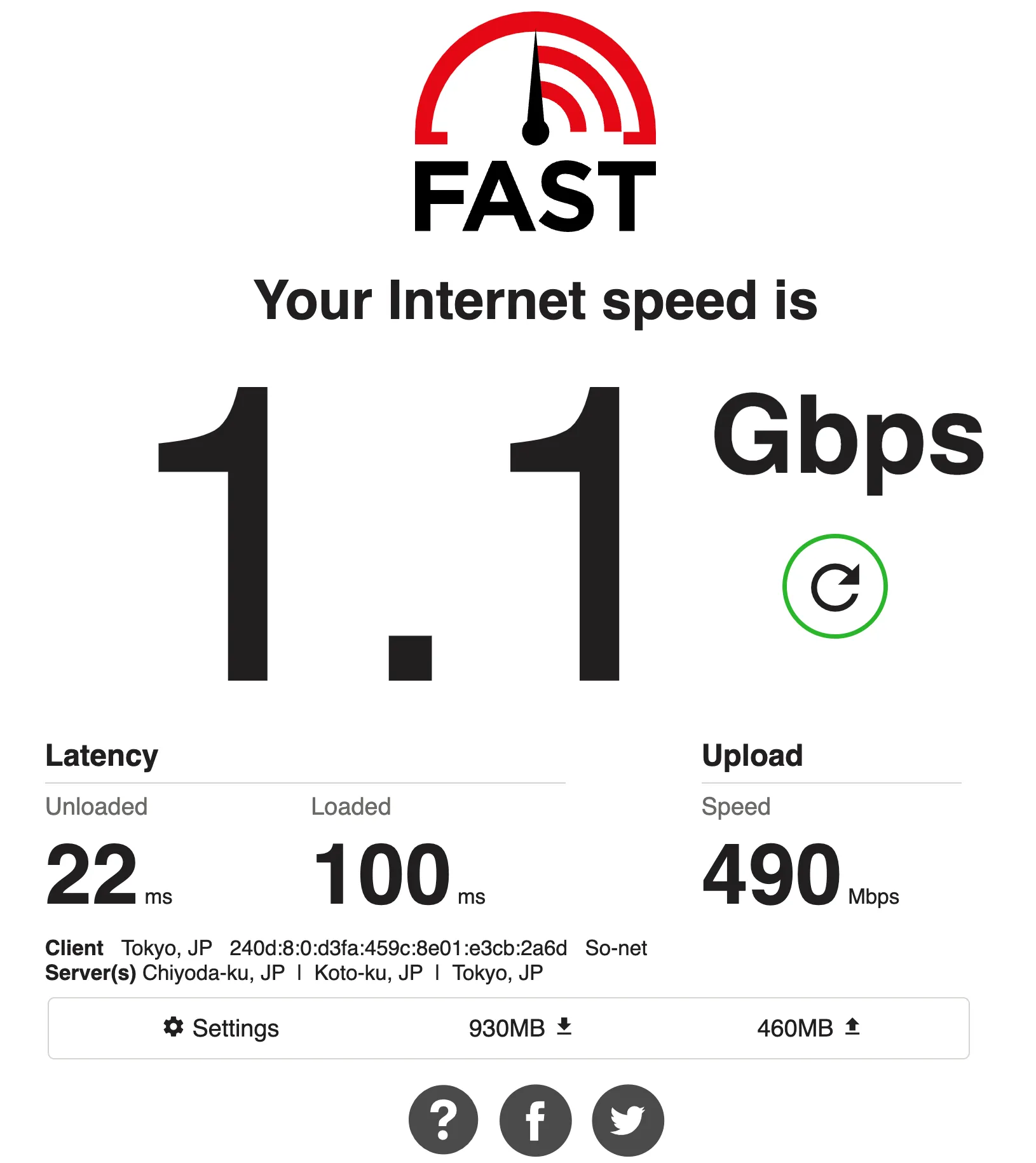 - Cloudflareのスピードテストの方は、fast.comより遅い結果となったのでnuro局内からcloudflareへの帯域が細そうです。