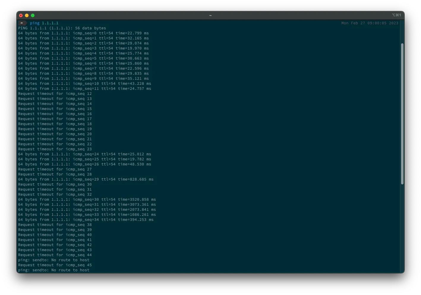 インターネット回線が調子悪いのか、WiFiが調子悪いのかを簡易的に判定するためにpingを打ち続けました。